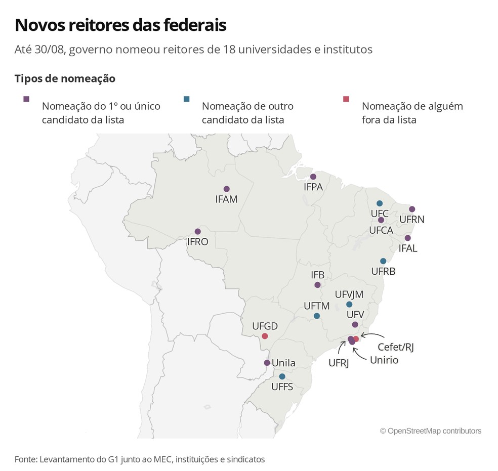 O levantamento feito pelo G1considera as nomeações ocorridas entre janeiro e esta sexta-feira (30). Os dados são de instituições, sindicatos, três entidades nacionais e do próprio MEC.