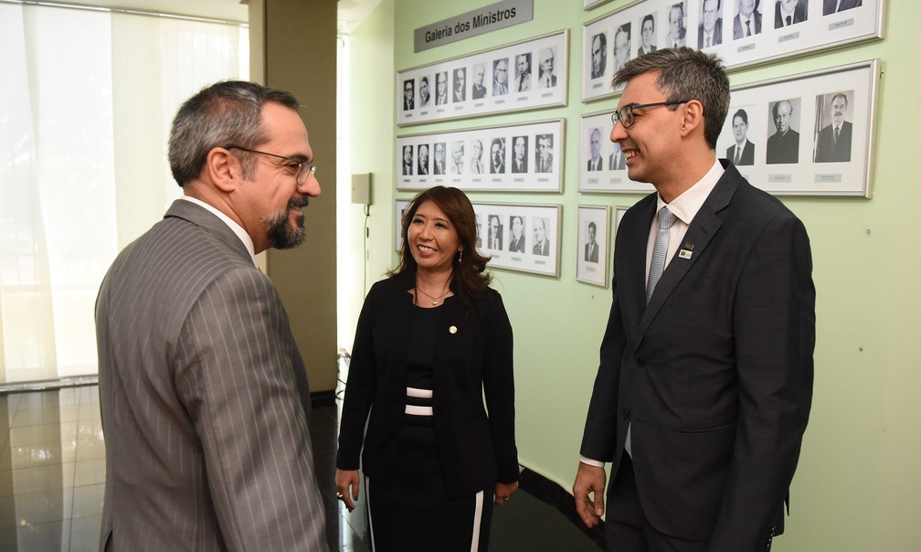 O ministro da Educação Abraham Weintraub com a reitora do IFB Luciana Massukado e o reitor do IFPA Cláudio Alex Jorge da Rocha em 27 de agosto, no dia da cerimônia de posse no MEC — Foto: Luís Fortes/MEC