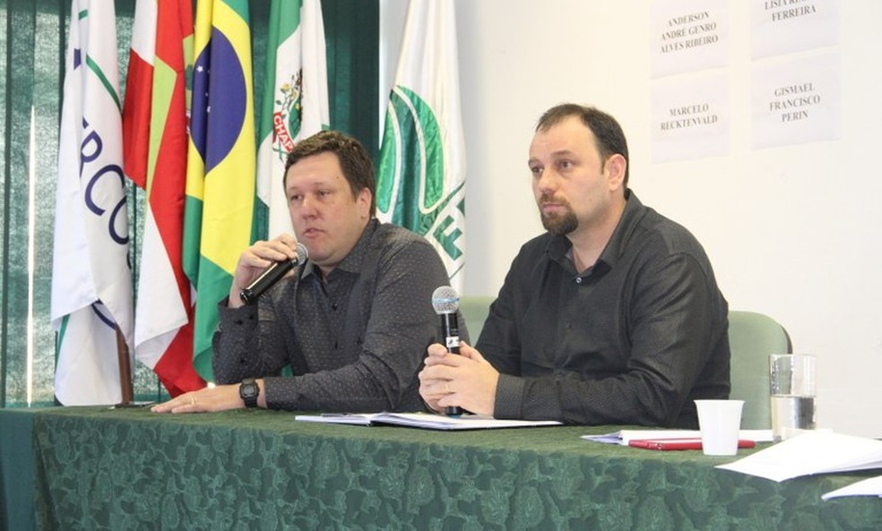 Marcelo Recktenvald e Gismael Francisco Perin, candidatos a reitor e vice-reitor da UFFS, durante apresentação de suas propostas na eleição de 24 de junho – último colocado na votação, Recktenvald compos a lista tríplice e foi nomeado pelo MEC nesta sexta (30) — Foto: Lia Pagoto/UFFS